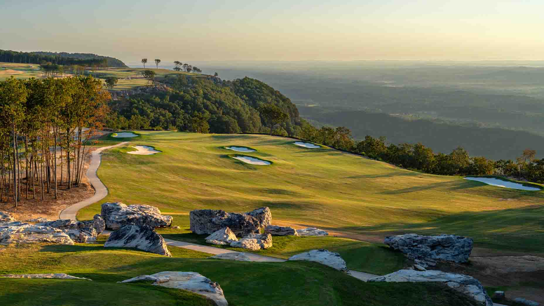 What was once land with only Jeep trails and trees became The Keep — a 7,700-yard layout that sits on a plateau atop Lookout Mountain. Five holes ride the cliff’s edge, providing captivating views, dynamic elevation changes, new Stadium Zoysia grass —the first of its kind in the U.S. — wide fairways, windswept angles and exposed rock outcroppings that deliver a unique golf experience.