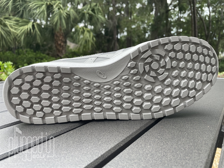 The first plus for the ASICS JAPAN S Golf shoes was that unboxing them made my wife proclaim, completely unprompted, “Oh, I really like those.” The dark clay grey looks sharp highlighted by the oyster grey signature ASICS stripes and oyster grey midsoles. I did have to chuckle at ‘clay grey’ as, around where I live, clay is a deep red. Without seeing the soles, the JAPAN S Golf shoes could easily be mistaken for court shoes. Flipping the shoe over, the sole reveals this ASICS JAPAN S is made for turf. The soles don’t necessarily indicate golf, so adding Golf to the name was a smart move.