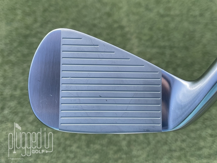 Before discussing performance, it’s worth reviewing the construction and materials of the TW767 Px heads. The “FORGED” stamp you see in the photos is on the S25C steel body. This low carbon material that forms the framework of the head lends itself to bending – a feature fitters appreciate. Honma designed two distinct faces for the Px set. In the 5 thru 8 irons, the L-Cup face is constructed of AM3550 stainless steel.