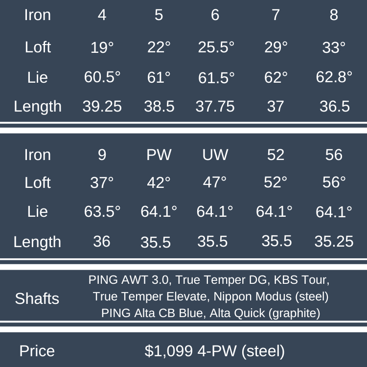 Finally, PING continues to lead the industry when it comes to custom fitting and providing golfers with plenty of options. They offer eleven stock shaft options, ranging from sub-40 gram graphite to Dynamic Gold at over 120 grams. PING continues to make their irons available with “Retro” and “Power” Spec Lofts for players that want higher flight or more distance, respectively. There’s also a G440 High Launch iron set which uses a lighter shaft, grip, and weights to help slower-swinging players create more distance.