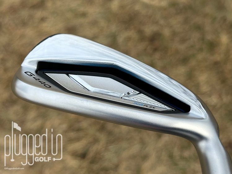 Finally, in the bag, the PING G440 irons have a sharp, high tech look. Most of the club has the familiar PING matte finish, but there’s a ribbon of chrome above the “cavity” with a stripe of blue just under that. The back of the club is dominated by the geometric PurFlex cavity badge that looks like a robotic eye. There’s very minimal branding – a small “G440” on the toe and “PING” only appearing on the hosel.