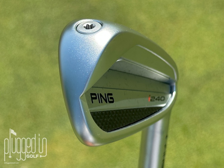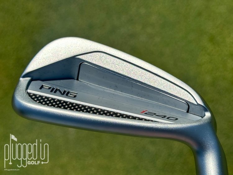 In the bag, the i240 irons are a little busier than the i230, but, in true PING fashion, it’s a look borne of function. The shaping is clean and classic – a traditional cavity back with a couple levels in the cavity. The branding is minimal, too. What stands out is the carbon fiber badge, the function of which I’ll discuss shortly.