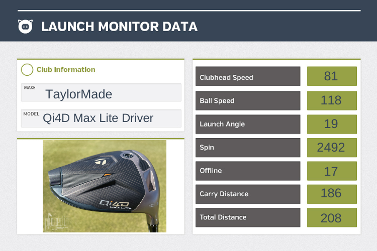 My performance results with the TaylorMade Qi4D Max Lite driver were a mixed bag. Swing speed average ticked up one MPH during my data collection session at Club Champion. Ball speeds were good, but not great. Launch and spin were a tad high, resulting in suboptimal total distances – not enough run out. Consistency was excellent, but I displayed a slight right bias.
