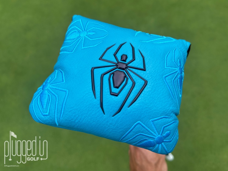 TaylorMade tied the look together with a bright blue head cover and a spider-themed SuperStroke grip and shaft band. I love all of these “extra mile” elements, and I want to particularly call out the design of the head cover. With a color this bold, the single black spider without any branding is an inspired choice.