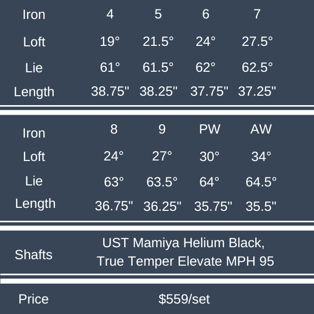 In my testing, both showed impressive distance off the face with slightly more spin in the E525 irons over the X525 ironwoods. This helps explain the difference in lofts between the two clubs. You can see the full loft specifications in the graphic below, but the pitching wedge is 42 degrees in the E525 irons while the X525 ironwood has a 43 degree pitching wedge. A small difference helps balance spin and trajectory for maximum distance.